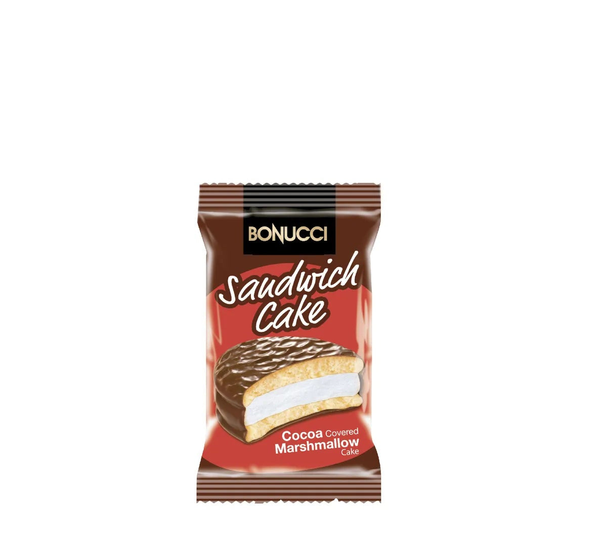 Bonucci Sandwich Cake – Prajitura cu blat de vanilie, glazura de cacao si crema marshmallow 23g x 24 x 2 bucati