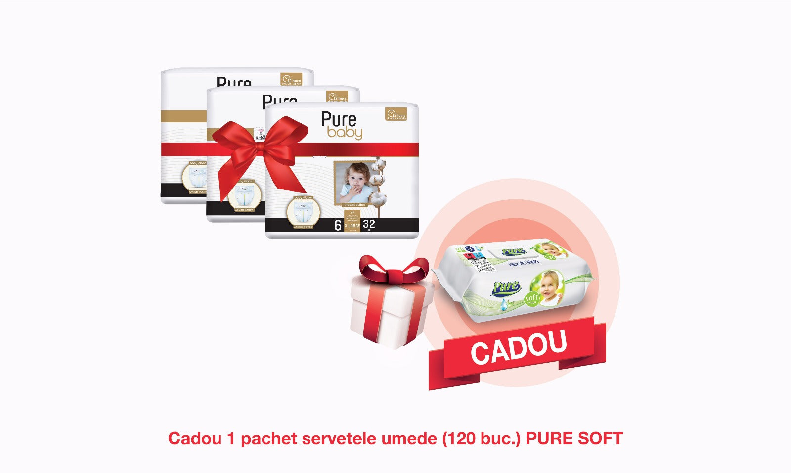 Pachet Promo: 3x PURE BABY Organic (6 X LARGE) + CADOU Servetele Umede Pure Soft (120 buc.)