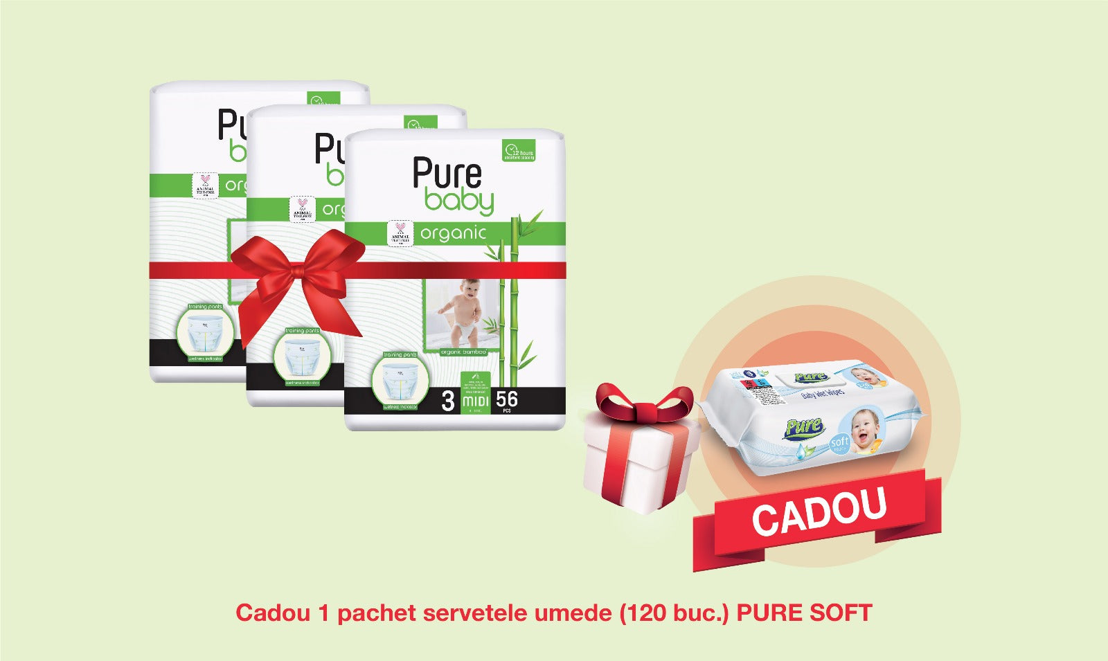 Pachet Promo: 3x Scutece PURE BABY Organic Bamboo (3 MIDI) + CADOU Servetele Umede Pure Soft (120 buc.)