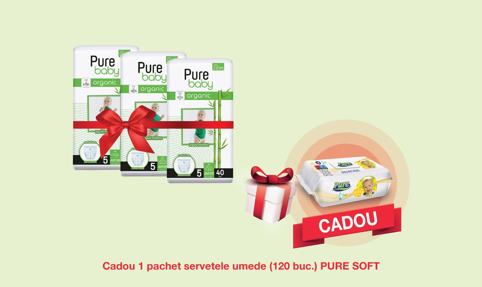 Pachet Promo: 3x Scutece PURE BABY Organic Bamboo (5 JUNIOR) + CADOU Servetele Umede Pure Soft (120 buc.)