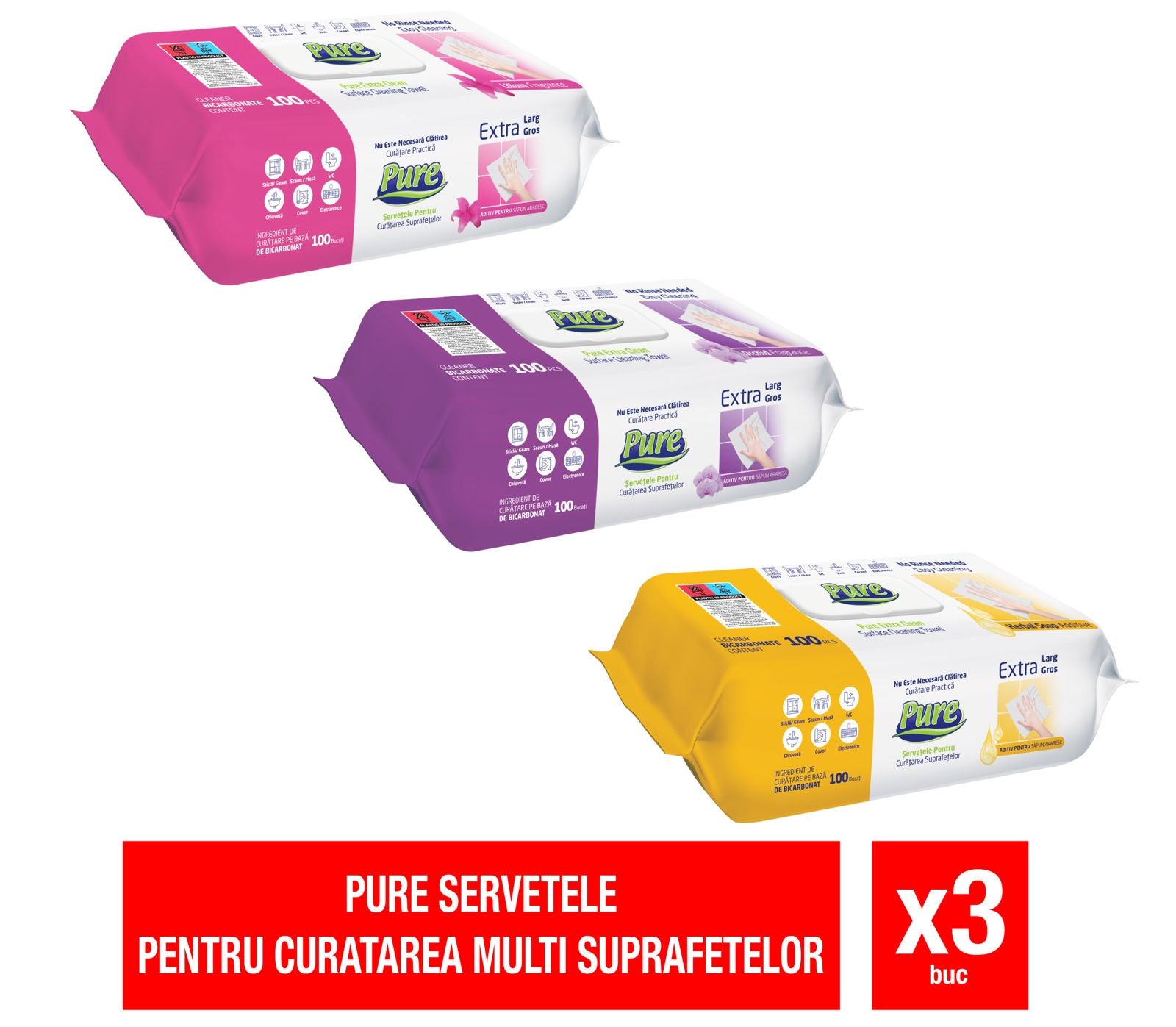 Pachet Promo Servetele umede pentru suprafete PURE 100buc/pachet - set 3 bucati diverse sortimente
