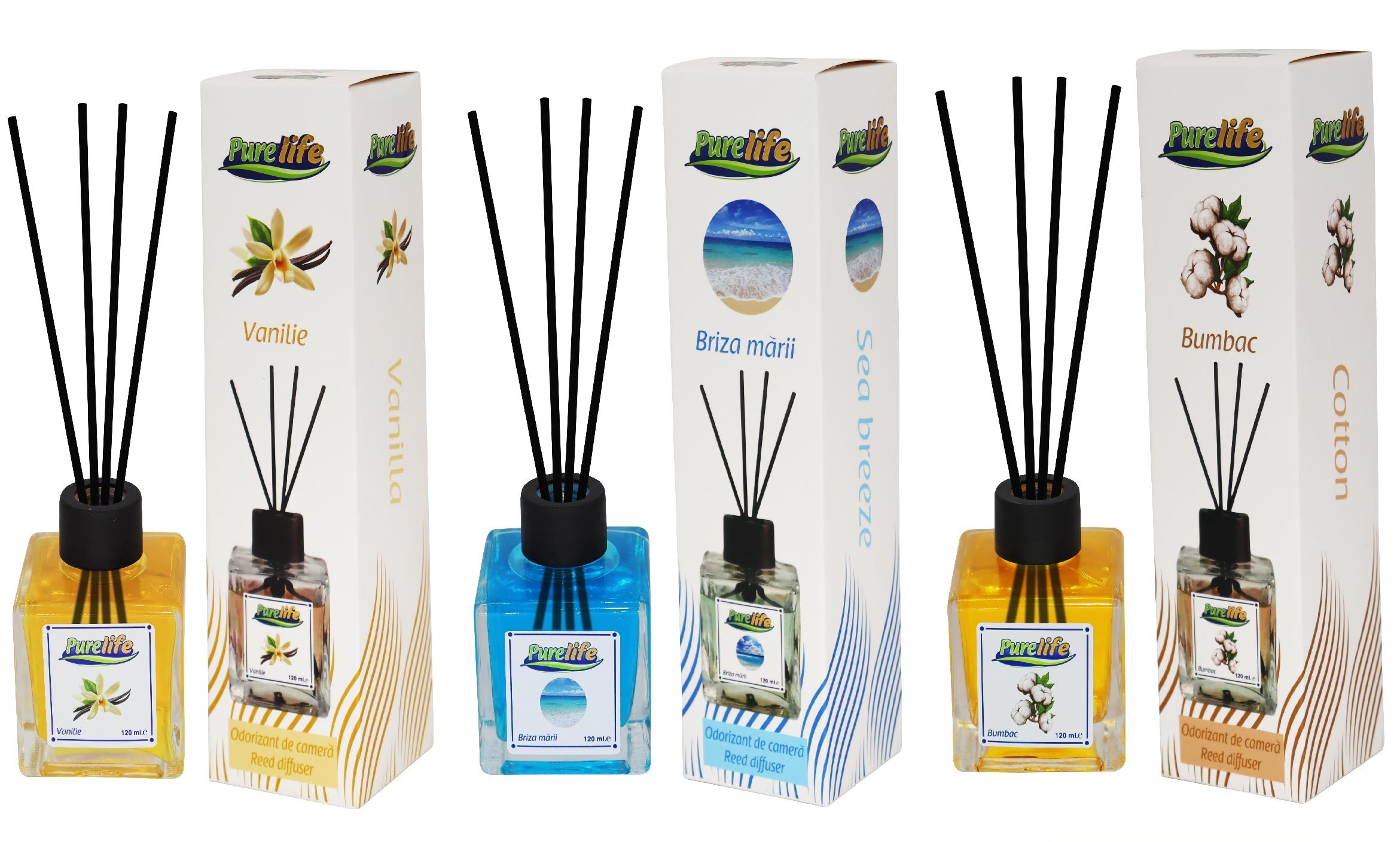 PureLife Odorizant de camera cu betisoare PureLife – 120 ml, Set 3 arome (Bumbac, Vanilie, Briza marii)