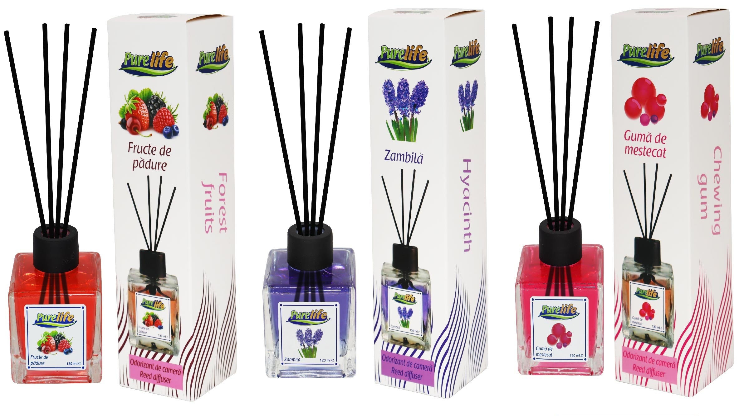 PureLife Odorizant de camera cu betisoare PureLife – 120 ml, Set 3 arome guma de mestecat, fructe de padure, zambila