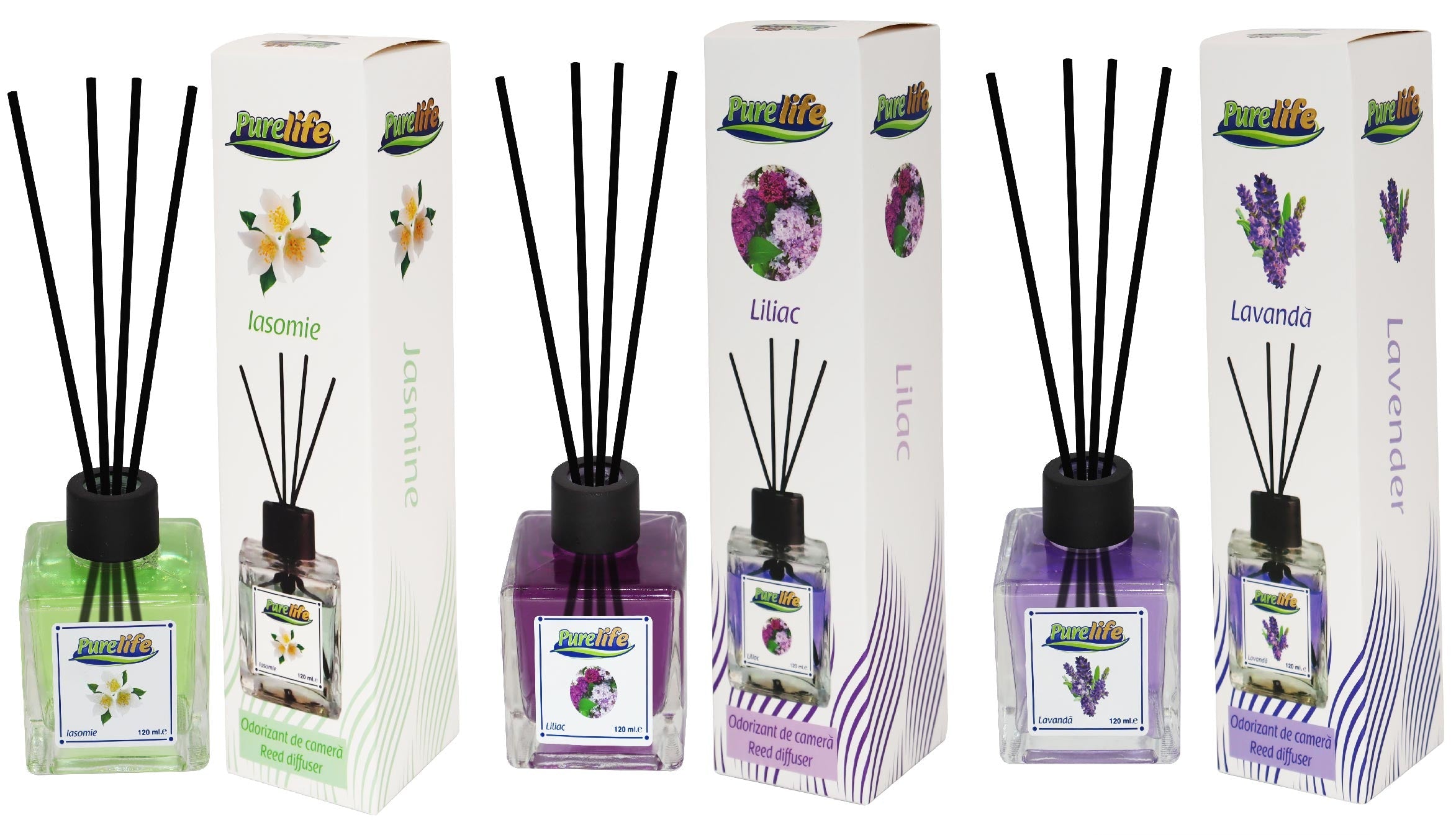 PureLife Odorizant de camera cu betisoare PureLife – 120 ml, Set 3 arome (Iasomie, Liliac, Lavanda)