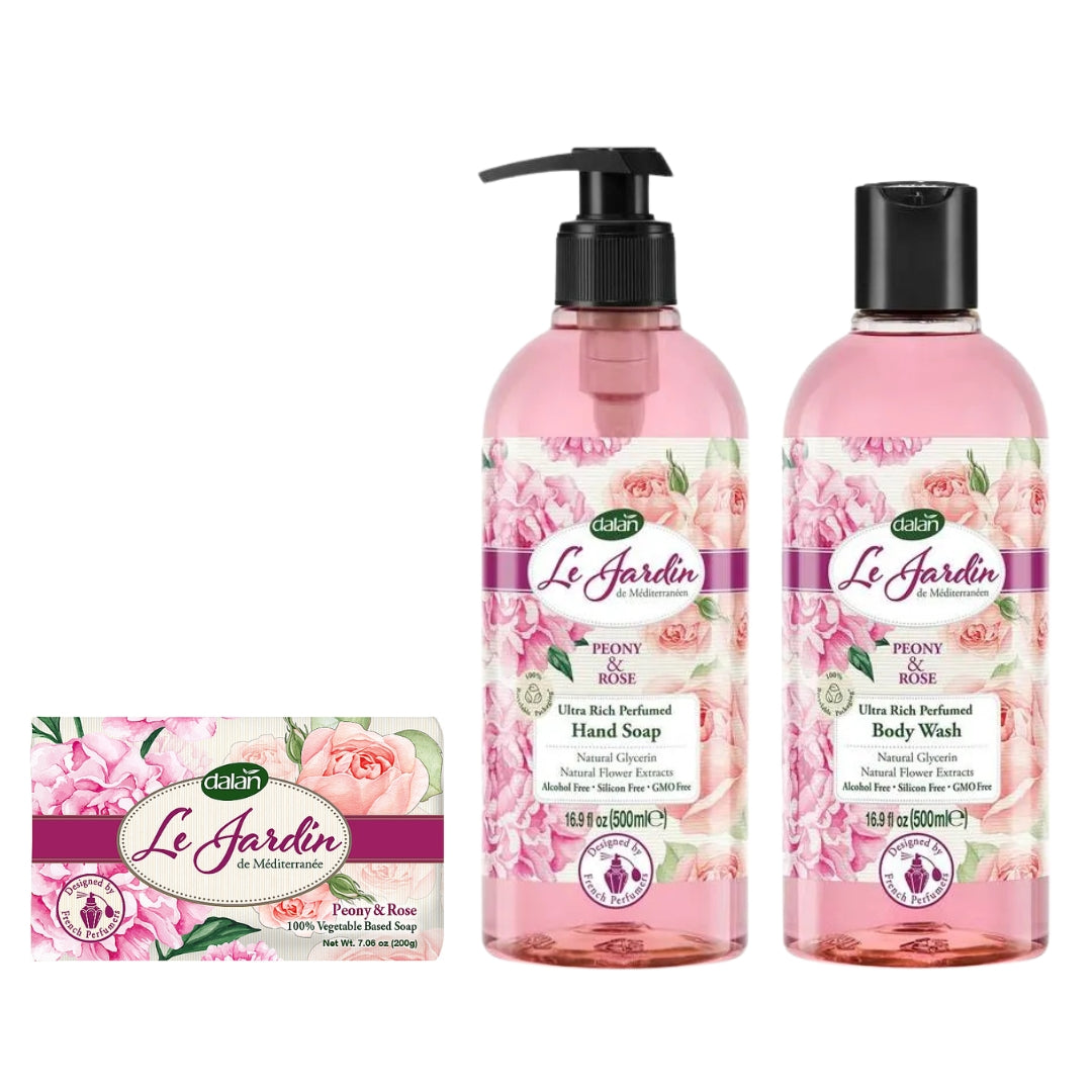 Set Le Jardin Trandafir 3 în 1 – Săpun Solid, Săpun Lichid și Gel de Duș cu Aromă de Trandafir